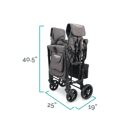 The W2 Elite offers a fabric, neoprene handlebar cover, all terrain EVA wheels, non-magnetic harnesses and does not offer added storage on the front of the rear basket.